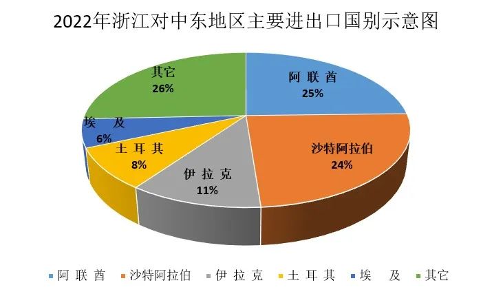 2022年,浙江对阿联酋和沙特阿拉伯分别进出口1338.1亿元和1318.0亿元,两者合计占同期浙江对中东进出口总值的48.8%。