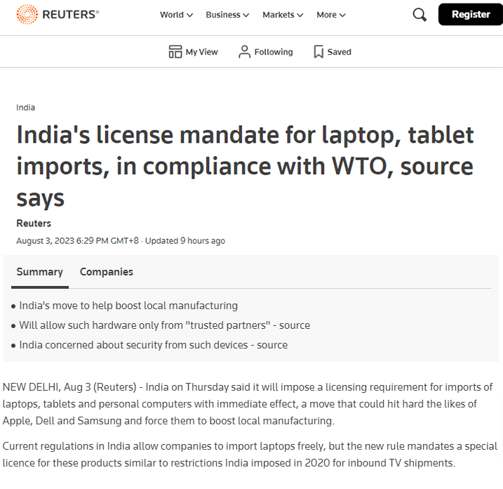 https://www.reuters.com/world/india/india-restricts-import-laptop-computers-govt-notice-2023-08-03/