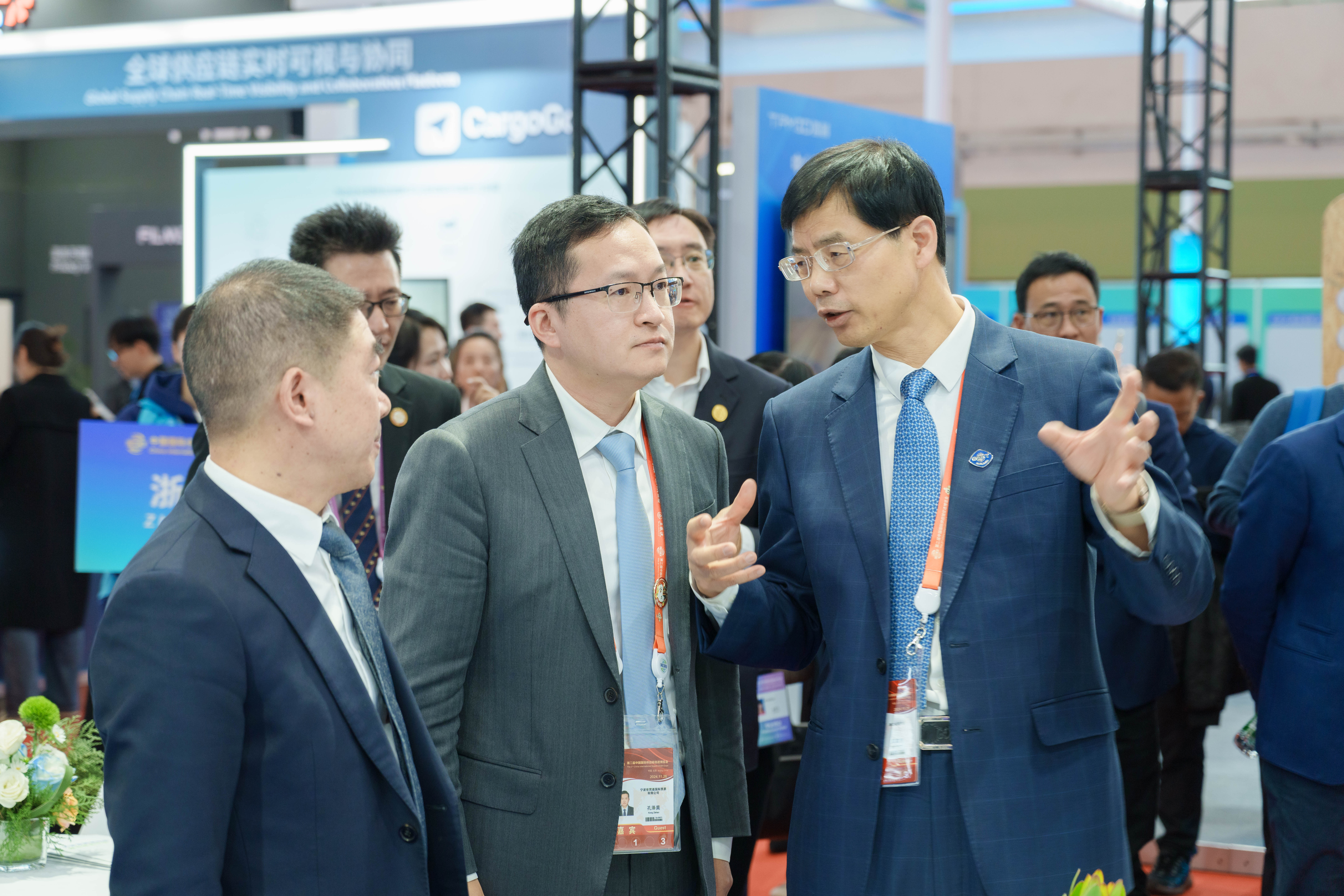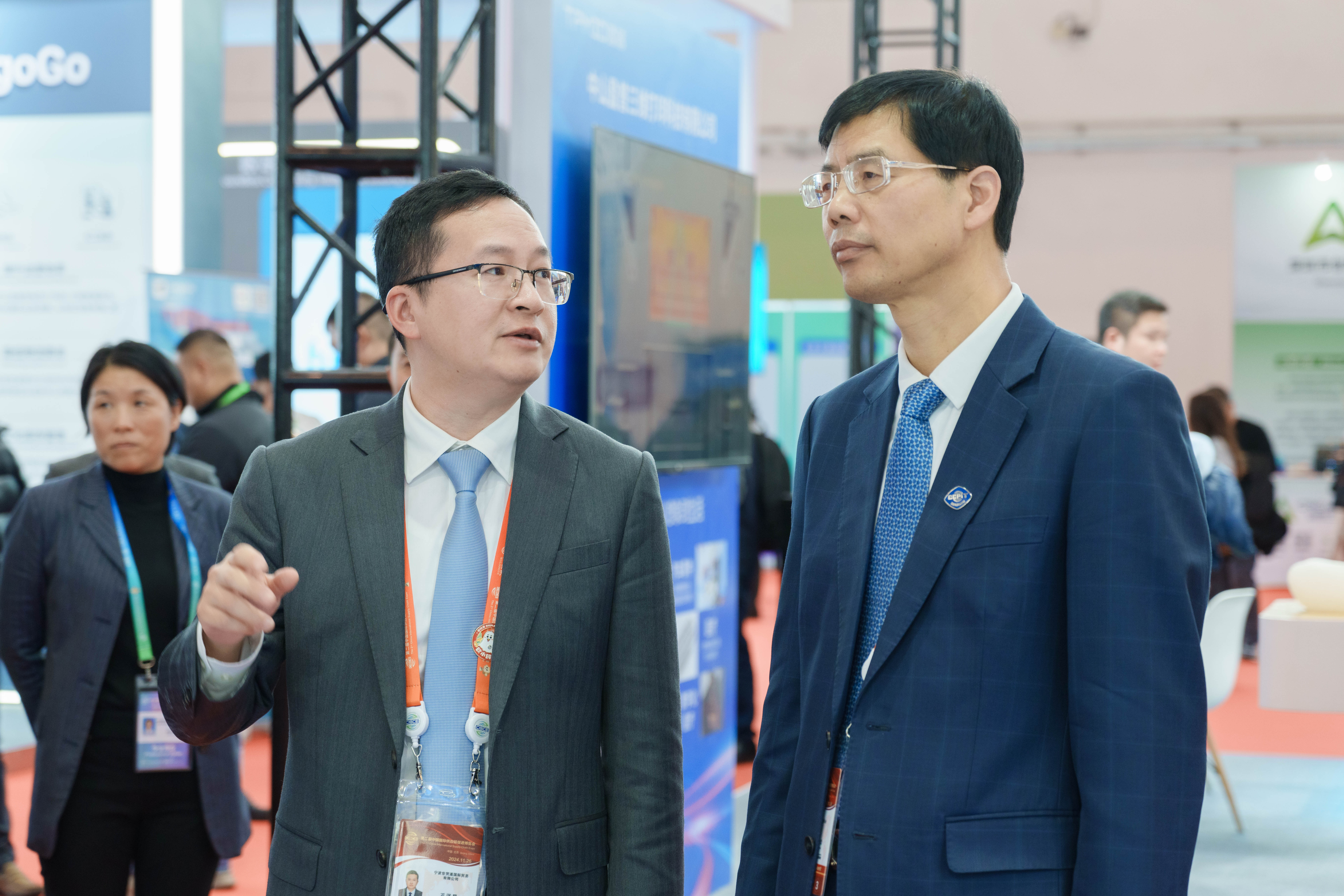26日下午,浙江省贸促会会长陈建忠、宁波市贸促会会长颜伟国到伟德bv1946官网展台交流。